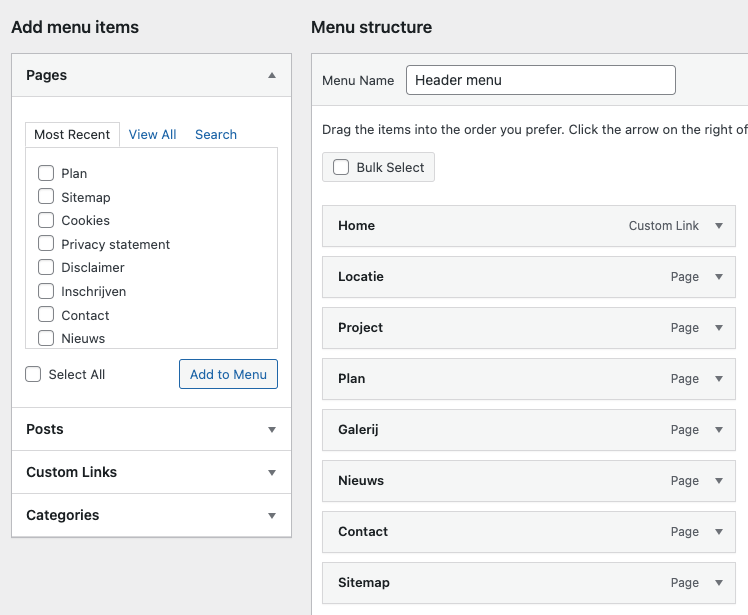 - Je kan een pagina aanvinken (of meerdere pagina’s) en druk vervolgens op “add to menu”