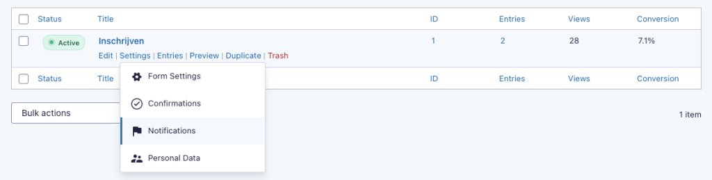 Mocht je het standaard formulier willen aanpassen op de contactpagina. Ga je naar “forms” om het formulier aan te passen. Wanneer je hier op hebt geklikt krijg je een overzicht van de bestaande formulieren.