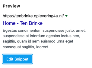 Je kan dan hier de meta titel en meta descripties aanpassen. Om dit te doen dien je op “Edit Snippet” te klikken. Wanneer je hierop klikt dan opent er een pop-up met hierin de mogelijkheid om de meta titel en descripties aan te passen. Na het aanpassen vergeet de pagina niet op te slaan.