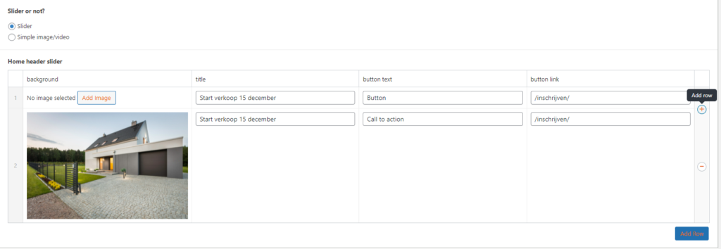 Onder deze opties is het mogelijk om foto’s aan een slider toe te voegen, als ook een titel toe te voegen. Door middel van op het plusje aan de rechterkant of add row te drukken