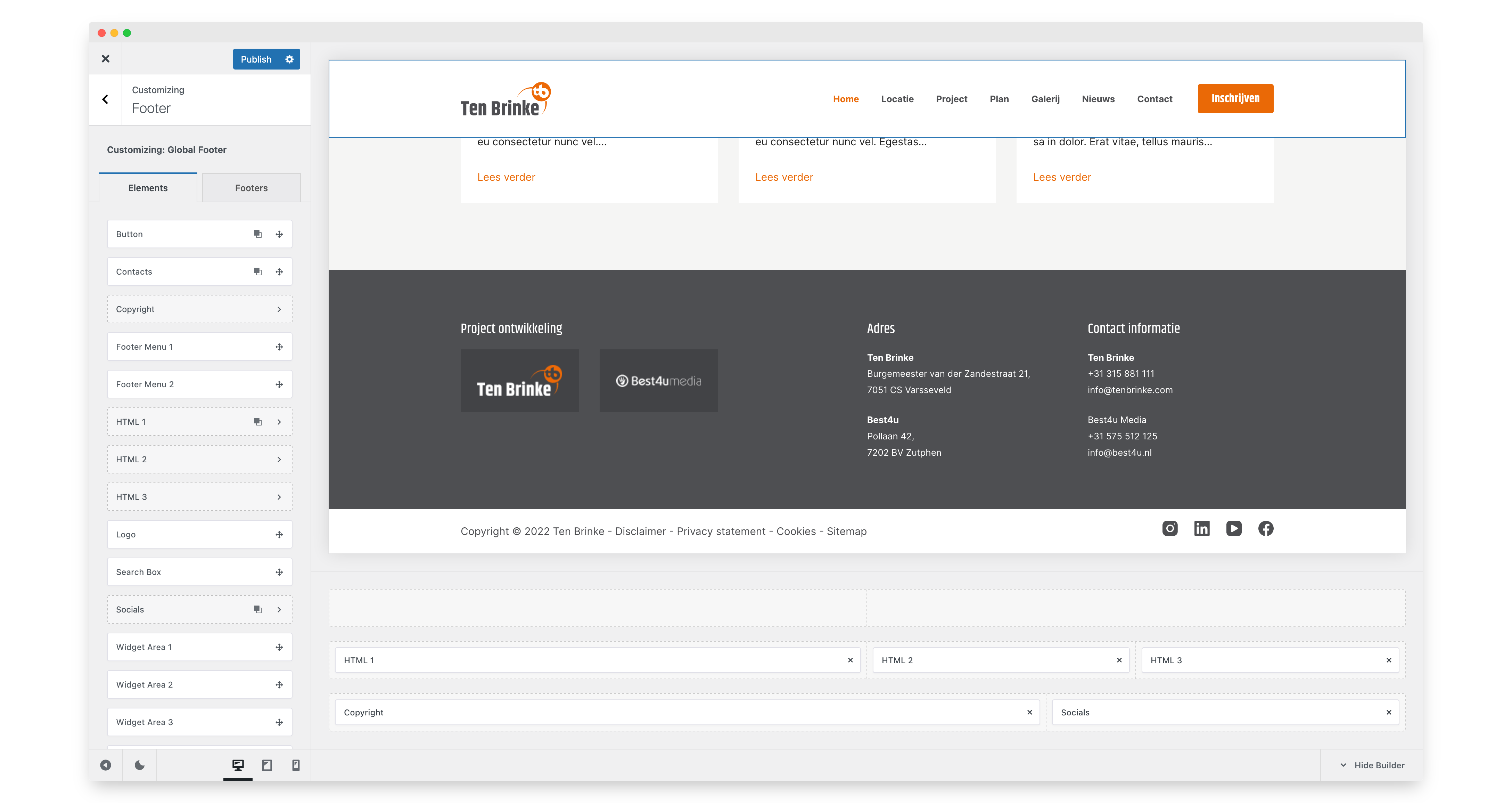 - Onderin in het midden staat de Footer builder. Hier is het mogelijk om alle content zaken van de footer aan te passen.